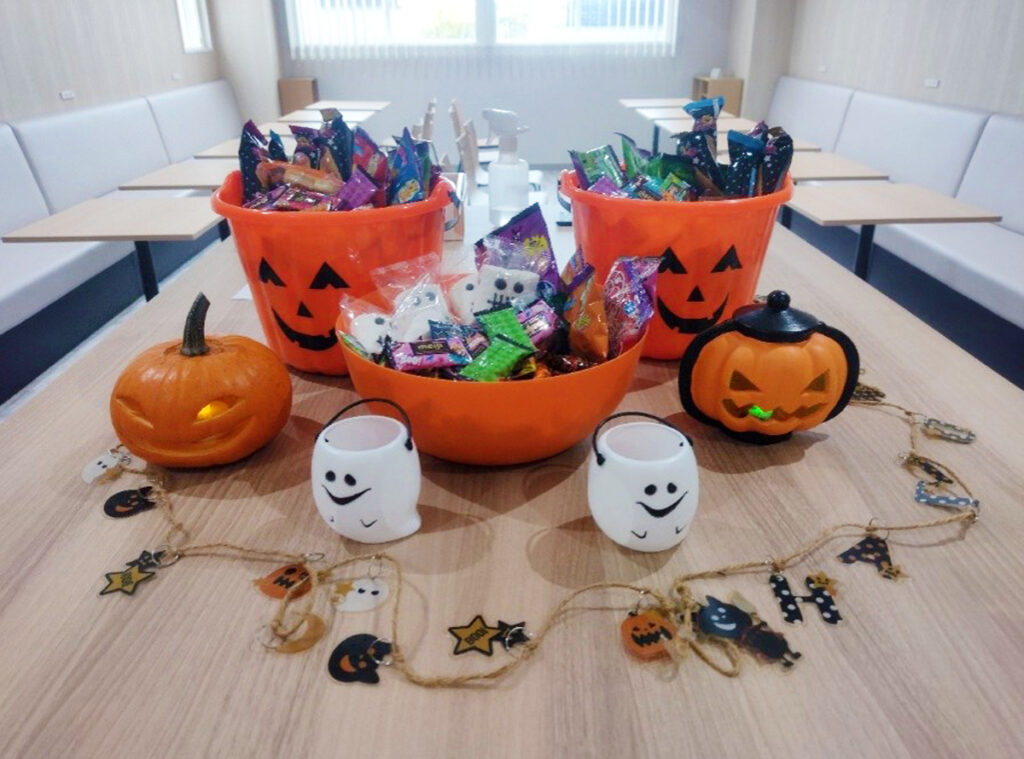朝晩の冷え込みが感じられる季節となり、今年もハロウィンの日が近づいて来ました。当社では一足先に、ささやかながらハロウィンの飾り付けを行い、お菓子の用意をしました。 リフレッシュルームでは社員が休憩の合間にお菓子を食べながらハロウィンを楽しみ、賑やかな雰囲気の中で自然と笑顔がこぼれます。
