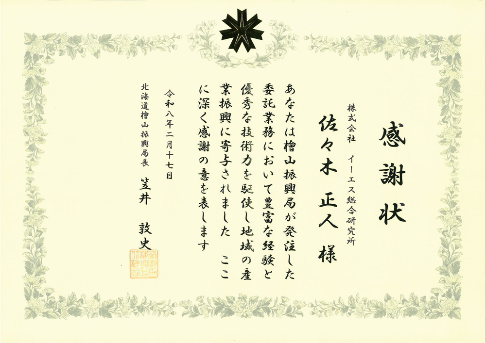 令和7年 檜山振興局優秀技術者等感謝状贈呈式が、令和8年2月17日に檜山振興局にて行われ、感謝状を頂きました。